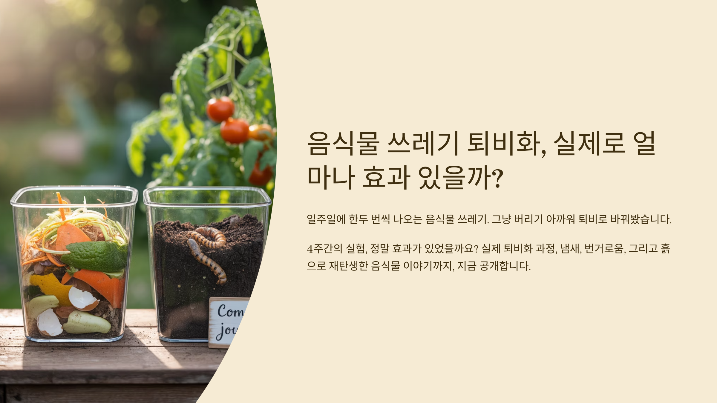 음식물 쓰레기 퇴비화, 실제로 얼마나 효과 있을까? 직접 실험해 봤습니다일주일에 한두 번씩 나오는 음식물 쓰레기. 그냥 버리기 아까워 퇴비로 바꿔봤습니다. 4주간의 실험, 정말 효과가 있었을까요? 실제 퇴비화 과정, 냄새, 번거로움, 그리고 흙으로 재탄생한 음식물 이야기까지, 지금 공개합니다. ✅ 1. 음식물 쓰레기 퇴비화, 왜 하게 됐을까?한 주 평균 약 2.5kg의 음식물 쓰레기가 나온다는 사실, 알고 계셨나요?저희 집도 다르지 않았습니다. 뚜껑을 열 때마다 올라오는 냄새, 종량제 봉투값, 뭔가 죄책감까지…“그냥 버릴 게 아니라, 흙으로 다시 태어나게 할 수 없을까?”이런 고민에서 퇴비화 실험이 시작됐습니다.✅ 2. 퇴비화 실험 준비: 어떤 방식으로 했는가사용한 방식: 가정용 수동 퇴비통 + 부엽토..
